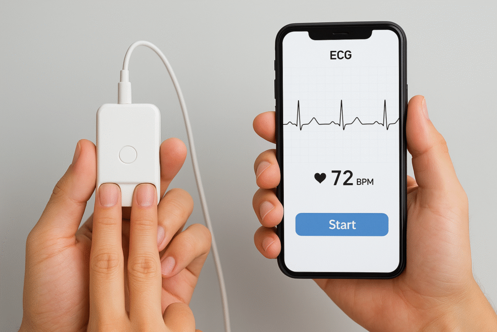 O ECG portátil é um dispositivo eletrônico compacto que capta sinais elétricos do coração de forma simples: basta encostar os dedos nos eletrodos ou aplicar o sensor no peito. Em segundos, ele envia os dados para um aplicativo no smartphone, que exibe o traçado cardíaco e registra diversas métricas.